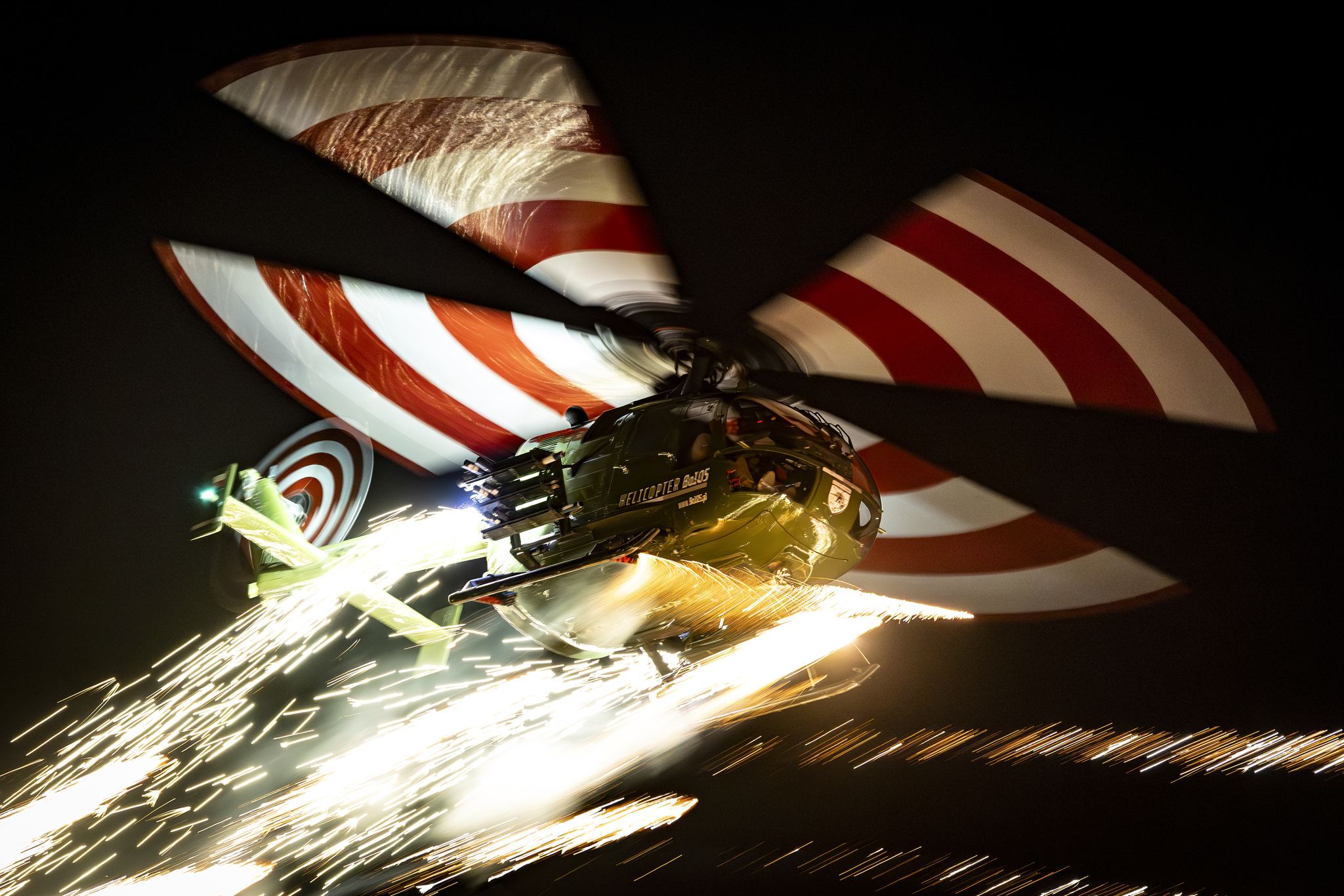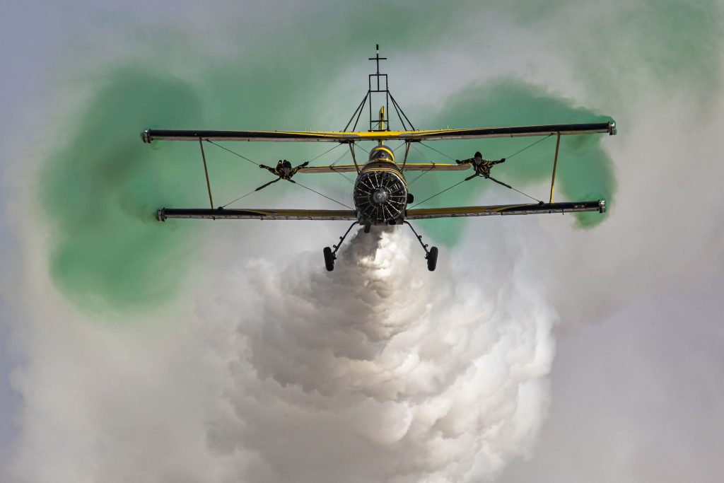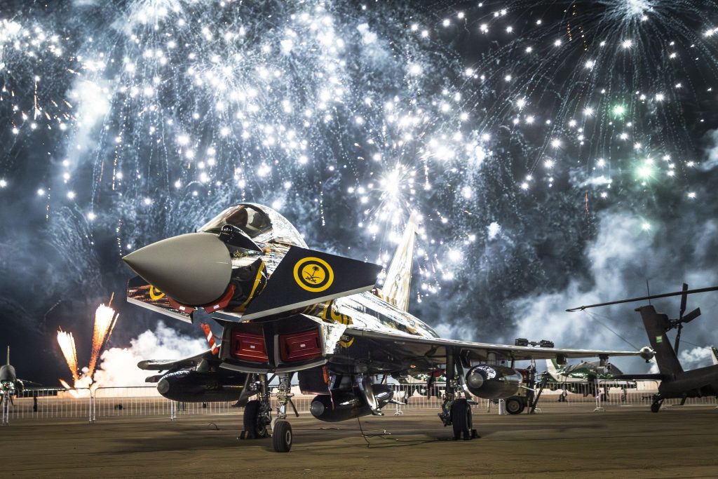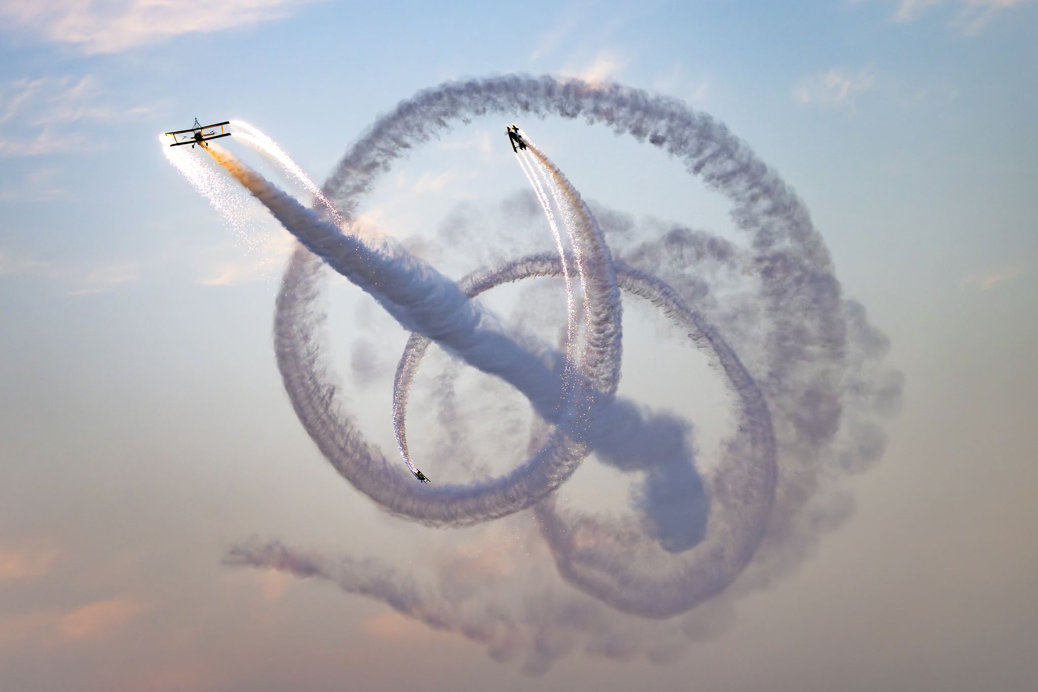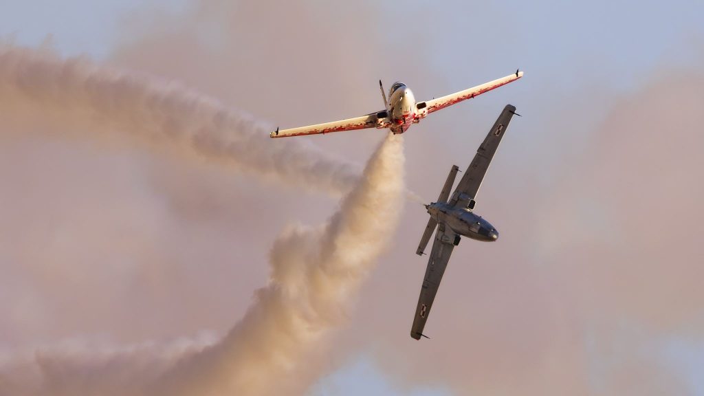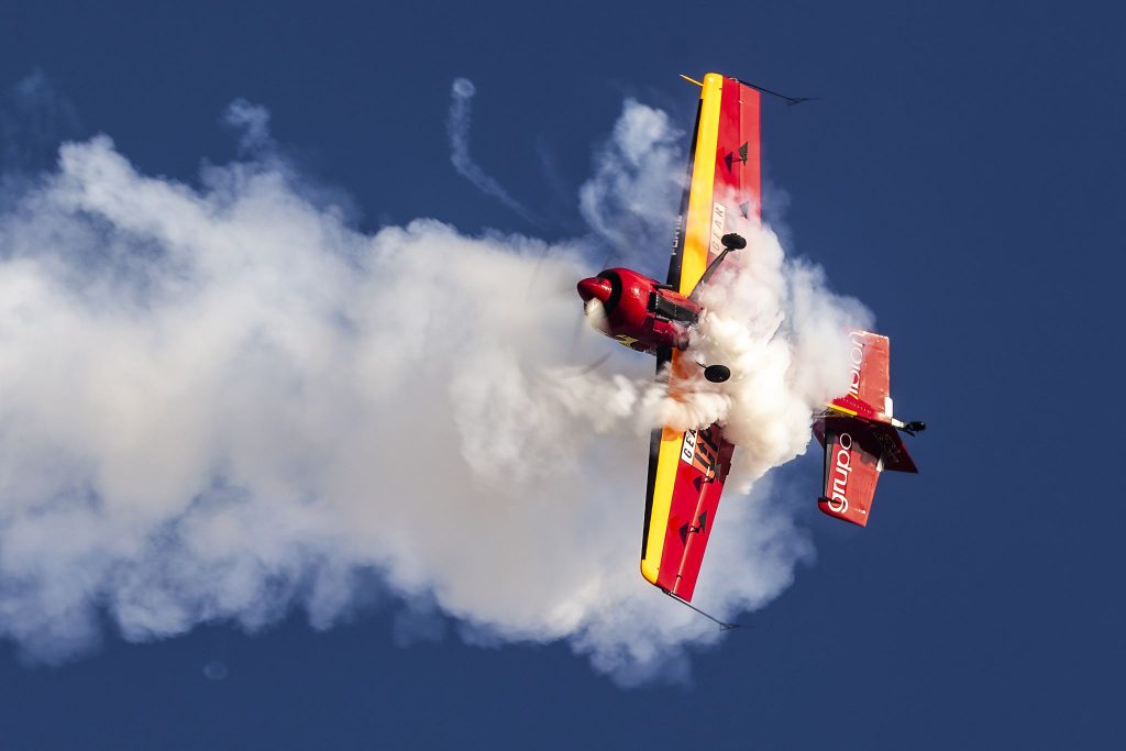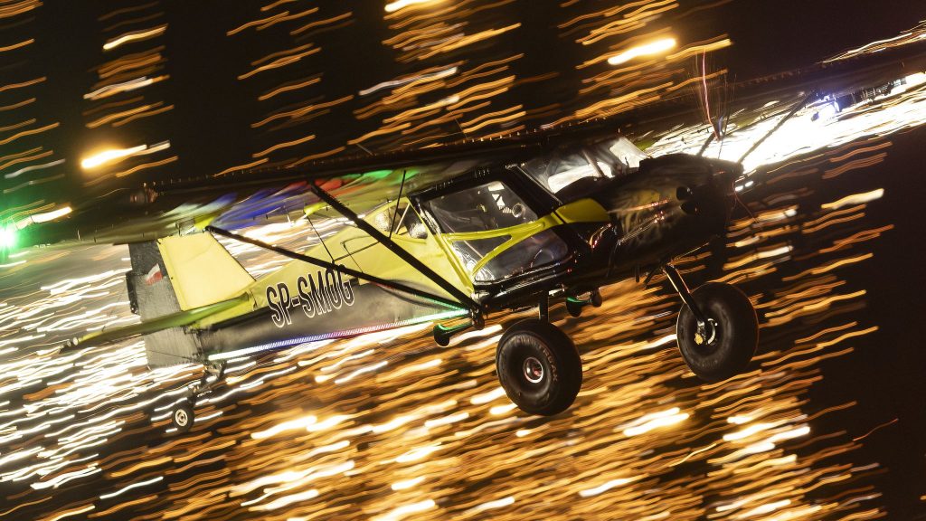 Takie warunki dla autofocusa to praktycznie pewna porażka… A Canon R5 Mark II nie zgubił się ani razu! Co mnie zadziwia do teraz, to to, że aparat śledził zablokowany obiekt w kadrze bez względu na pojawianie się wokół licznych strumieni fajerwerków i świateł. Tu niestety muszę stwierdzić, że poprzednik w tych warunkach sobie nie poradził. Przesuwał AF na wybuch pirotechniki za samolotem, czy na ciągnącą się łunę światła spowodowaną fajerwerkami podczepionymi pod skrzydłem.